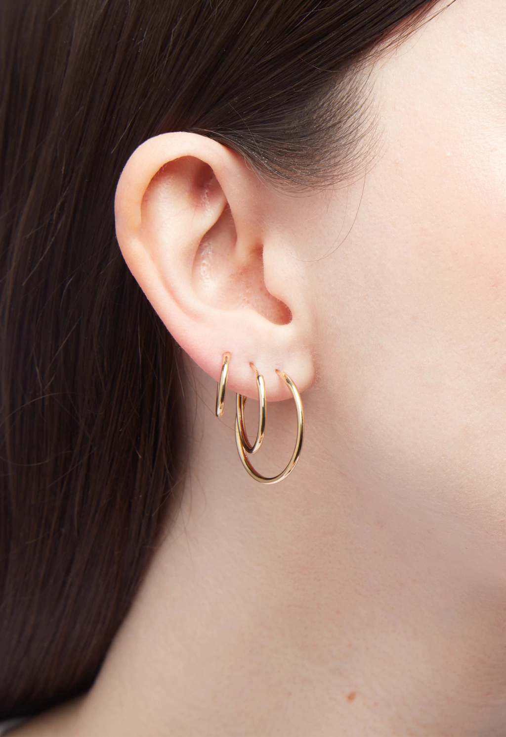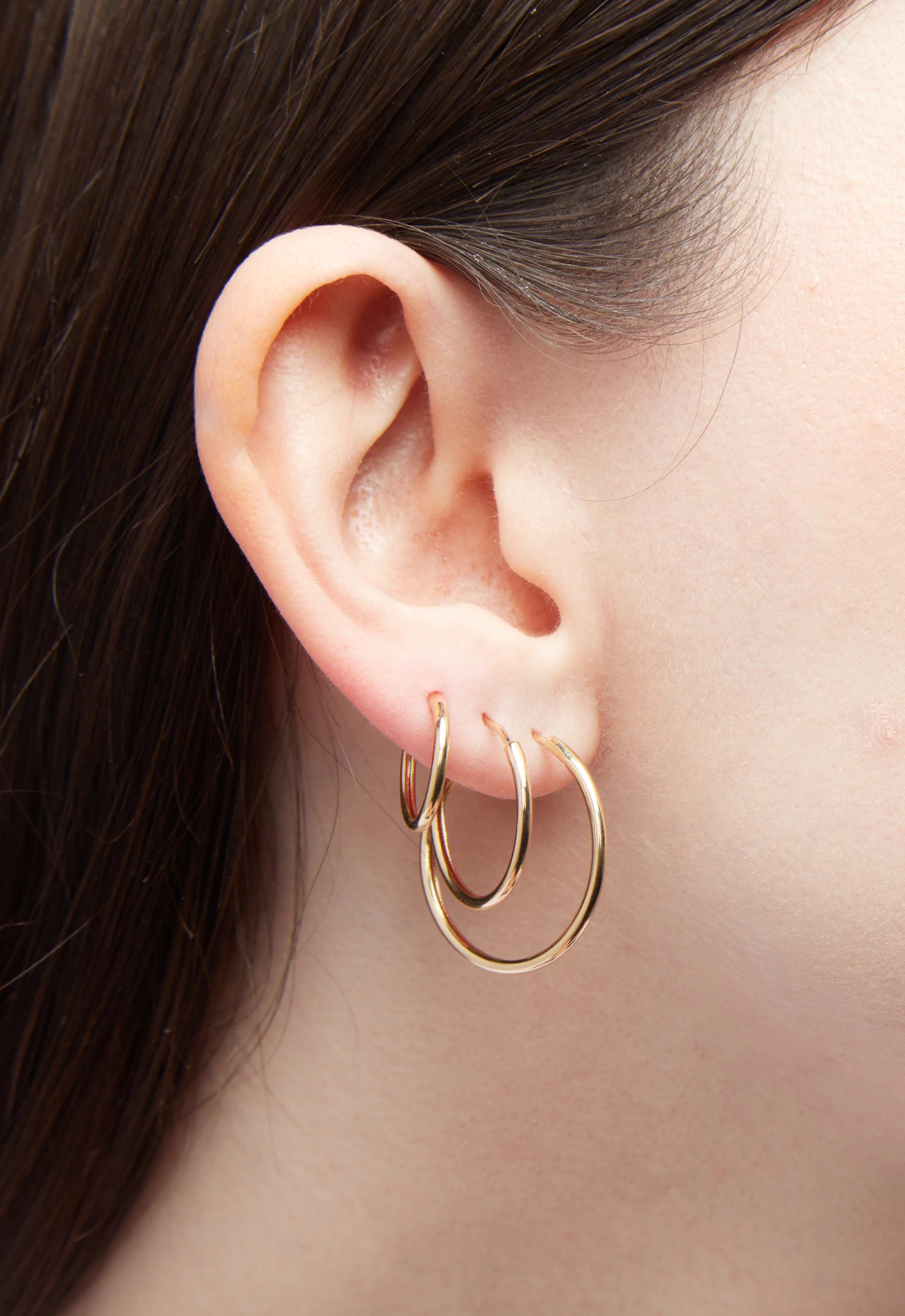 Um trio composto por 3 pares de brincos Fio em 3 tamanhos diferentes confeccionados em latão com tratamento hipoalergênico, banhada em 5 camadas de ouro 18k e finalizada com verniz de joalheiro, conferindo um brilho duradouro e sofisticado.